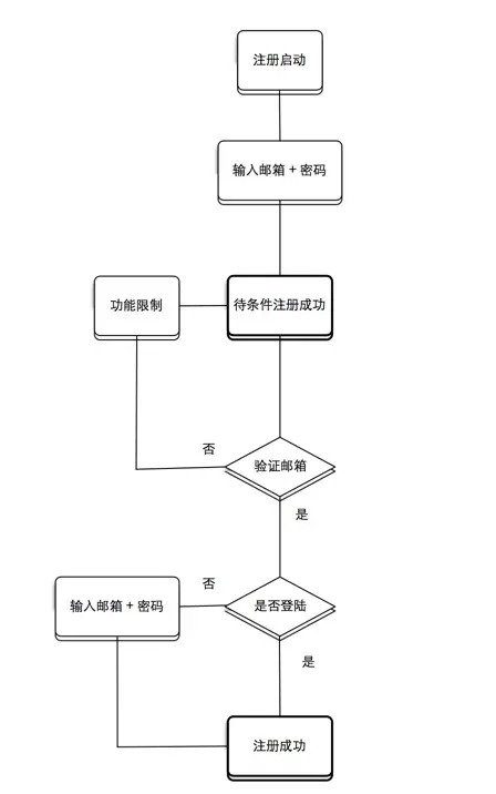 流程4的一切的主要流程还是不变的,但是在用户完成邮箱密码的输入后即可登录,但是是以待条件的状态登录,例如不可以发布,不可以评论等等,当用户需要使用这些功能的时候再提示用户去验证。这样可以提升一些用户的使用体验。