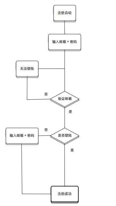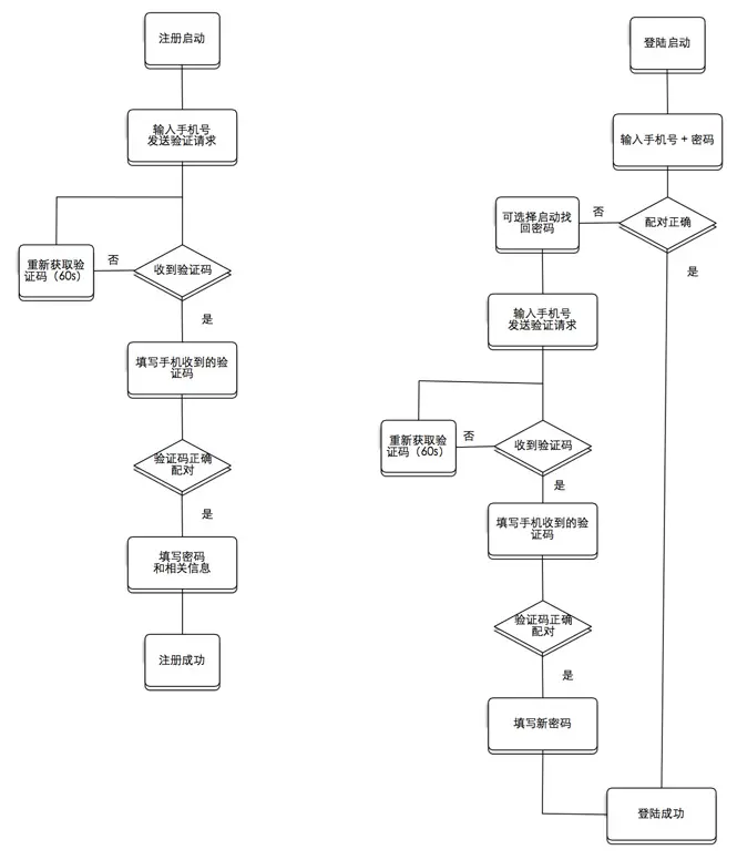 手机号注册多见于移动端产品中,注册时使用手机号当做用户名,此时需要手机接收验证码来确认配对,配对可以为了确认注册的手机号是用户本人的,可以防止输入手误或他人恶意注册带来的风险。手机配对之后再输入密码和一些产品需要的相关信息,如昵称、性别、兴趣等,这些就与主要注册流程无关了。以下为手机注册的流程图(此流程图只绘制了最核心的流程,如果在PRD用,还需要加工补全逻辑。)