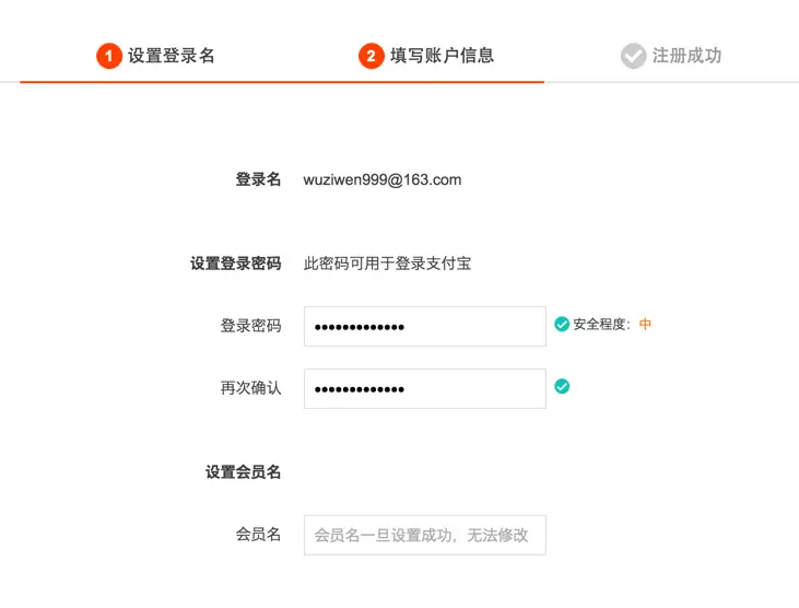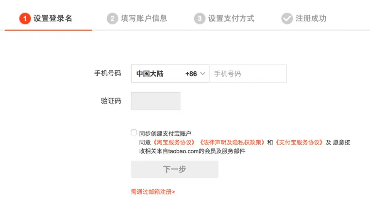 在注册方面,淘宝采用手机号、邮箱、用户名同时注册的方式,注册时这三个自建系统的方式都为必填,在注册完成后会有很强的引导绑定微博账号。同时还会强制同步创建支付宝账户。