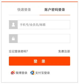 首先,从登录界面可以看出,淘宝采用了自建系统 + 三方登录的模式,其中自建系统中手机号、用户名(会员名)、邮箱都可以登录。三方方面只采用了微博,原因不用多说了。此外还有支付宝账户登录,属于同门的三方账户关联。