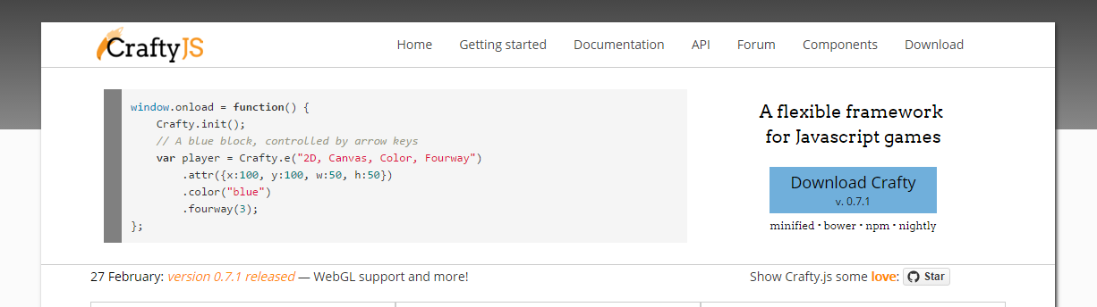 Crafty是一个体积小、简单、轻量级的2D的HTML5游戏引擎,它提供了通过Canvas或DOM来绘制实体,提供了精灵Map以及SAT高级碰撞监测支持。它是由个人(Louis Stowasser)创建,同时由Github上的一些开发者共同开发。