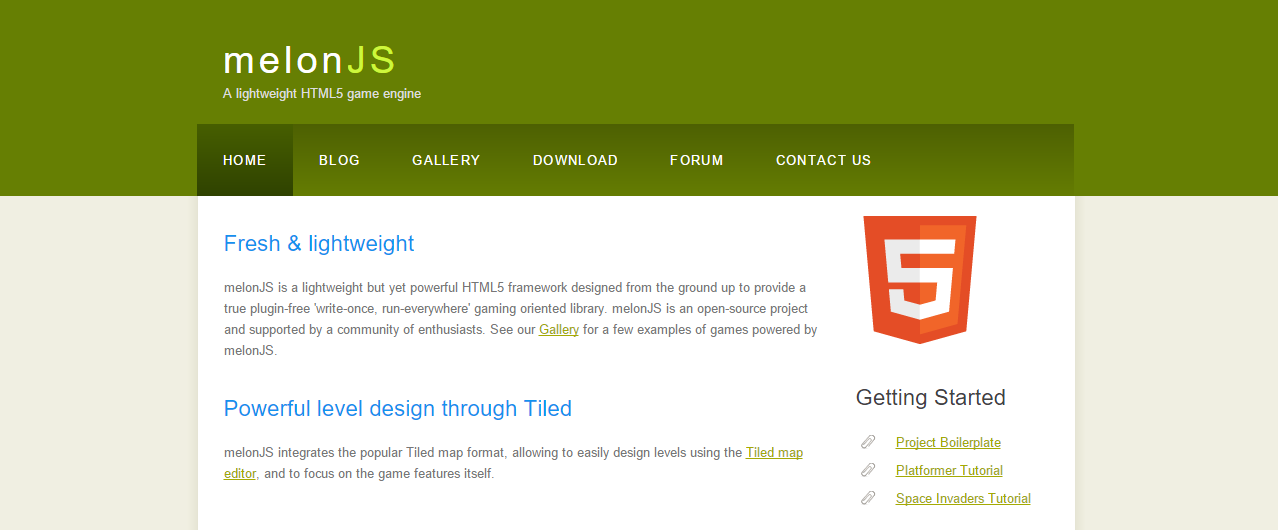 melonJS是一个全新、轻量级,基于精灵的2D游戏引擎。兼容所有支持HTML5览器包括:Chrome、Safari、Firefox、Opera。支持多声道。提供基本物理和碰撞机制(以确保CPU的要求低),一组基础的实体对象(可扩展)。支持补间动画效果。一个状态管理器(可以轻松管理加载,菜单,选项和在游戏画面状态的开关)。提供一些基本的GUI元素。一个可定制的加载器。