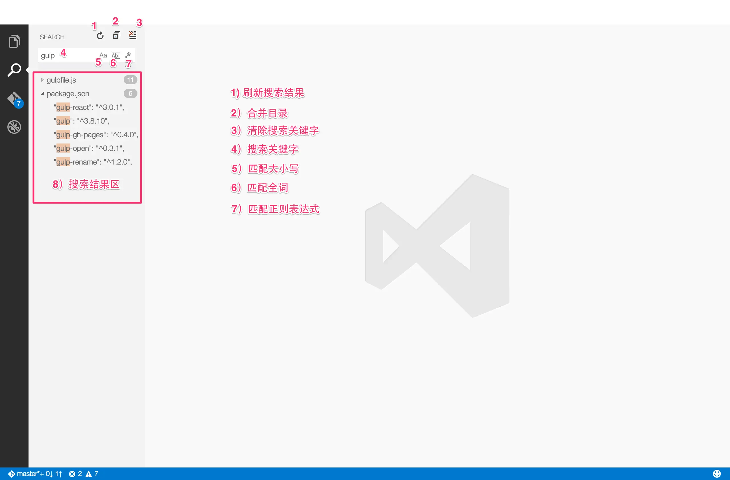 分别是文件夹,搜索,git和调试