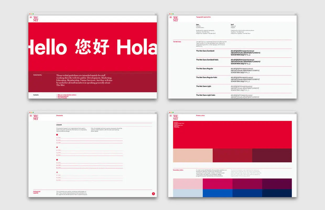 以大都会艺术博物馆的视觉识别系统为例——它要作为基础,为博物馆的发展提供一个能让人去添砖加瓦的定调方向——它的作用,就像一片能保持与大都会艺术博物馆全新的体验设计与时俱进的馆舍。“在数字化日渐普及的今天,the Met如果想要在吸引世界各地的参观者同时,做到同样程度地主动将触角伸向国际领域,它需要整套更富有活力的视觉系统。单靠一个logo不足以去表现博物馆的个性和它想要创造参观的体验。”Wolff Olins的战略总监Amy Lee说。The Met 项目的设计总监Susan Sellers在聊到大都会艺术博物馆的品牌重建时也表示,“要把这件事情说清楚很不容易,而说实话,仅凭这个logo也没法把事情说清楚。”