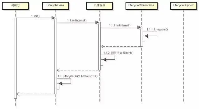 1. 调用方调用容器父类LifecycleBase的init方法,LifecycleBase的init方法主要完成一些所有容器公共抽象出来的动作;