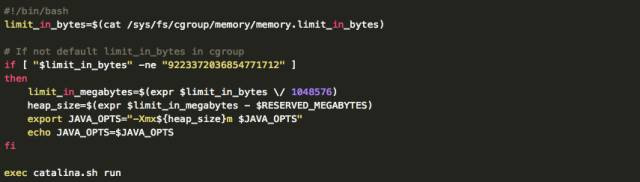,其源代码可以从Github 获得。它基于Docker官方Tomcat镜像创建,它的启动脚本会检查CGroup中内存限置,并计算JVM最大Heap size来传递给Tomcat。其代码如下