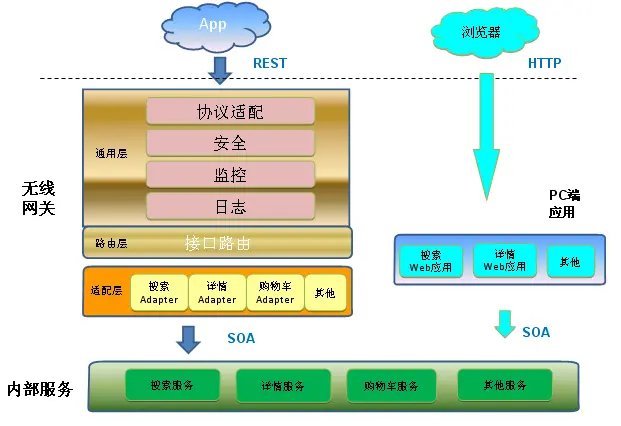 外部无线接口和内部SOA接口的输入输出格式以及通信协议很可能不一样,比如前者经常是HTTP+JSON格式,后者可能是Hessian+二进制格式,Adapter首先用于无线接口和内部SOA接口的适配,除此之外,Adapter还可能对多个SOA服务做聚合,对APP提供粗粒度的数据,以减少远程网络调用次数。实现上一般每个业务系统有一个Adapter,负责本系统无线接口的调用适配。
