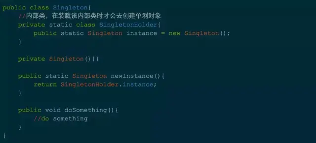 采用内部类,在这个内部类里面去创建对象实例。这样的话,只要应用中不使用内部类 JVM 就不会去加载这个单例类,也就不会创建单例对象,从而实现「懒汉式」的延迟加载和线程安全。