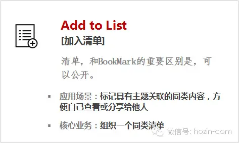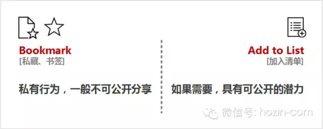 Bookmark,是一种私有行为,一般不可公开分享;Add to List,在需要的情况下,具有可公开的潜力;