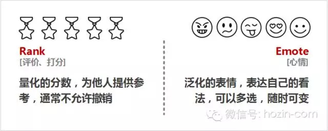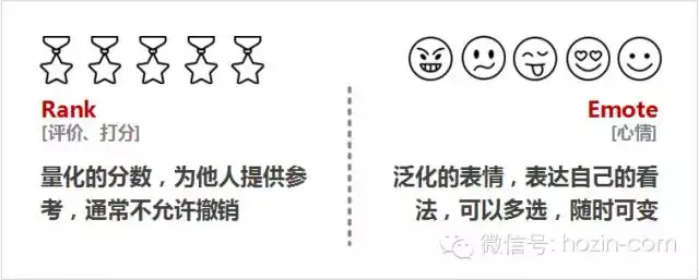 Rank,是量化的分数,为他人提供参考,通常不允许撤销;Emote,是泛化的表情,表达自己的看法,可以多选,随时可变