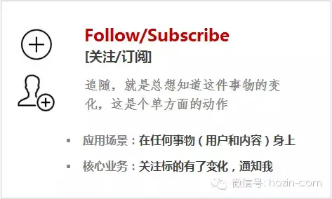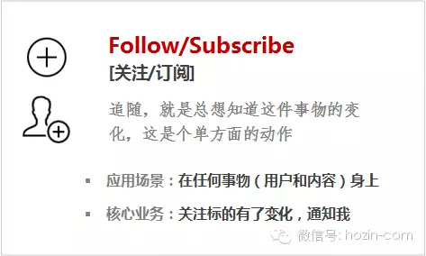 追随,就是总想知道这件事物的变化,这是个单方面的动作,同义词是订阅Subscribe