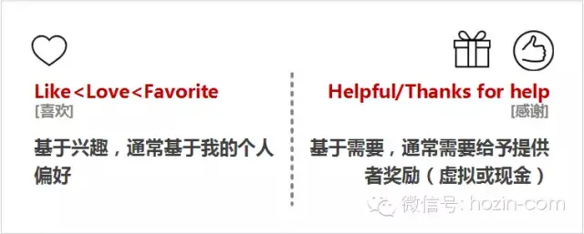 Like,基于兴趣,通常基于我的个人偏好;Thanks,基于需要,通常需要给予提供者奖励(虚拟或现金)