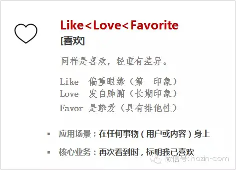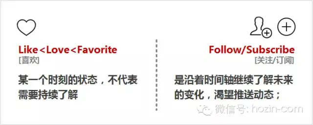 Like/Love/Favor,只是某一个时刻的状态,不代表需要持续了解;Follow,是沿着时间轴继续了解未来的变化,渴望推送动态;