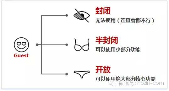 没有身份即无法使用(连查看都不行),称为“封闭”;没有身份,可以使用少部分功能,称为“半封闭”;没有身份,可以使用绝大部分核心功能,称为“开放”。