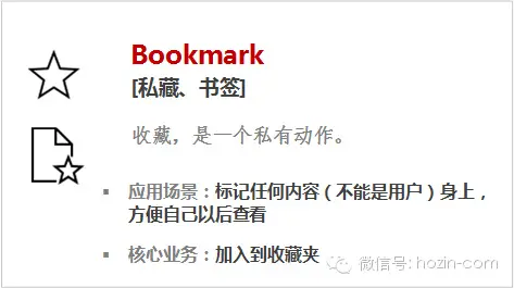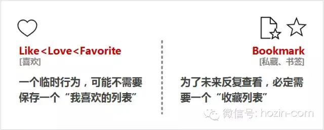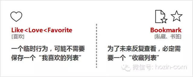 Like,是一个临时行为,可能不需要保存一个“我喜欢的列表”;Bookmark,是为了未来反复查看,必定需要一个“收藏列表”