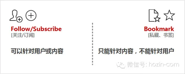 Follow,可以针对用户或内容;Bookmark,只能针对内容,不能针对用户