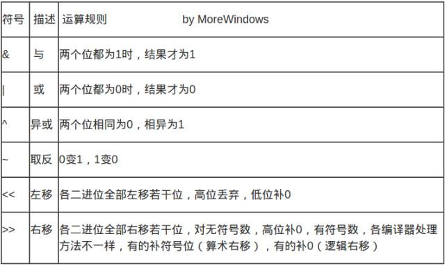 基本的位操作符有与、或、异或、取反、左移、右移这6种,它们的运算规则如下所示: