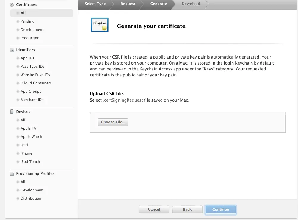 choose File..选择创建好的:CertificateSigningRequest.certSigningRequest文件,点击Generate