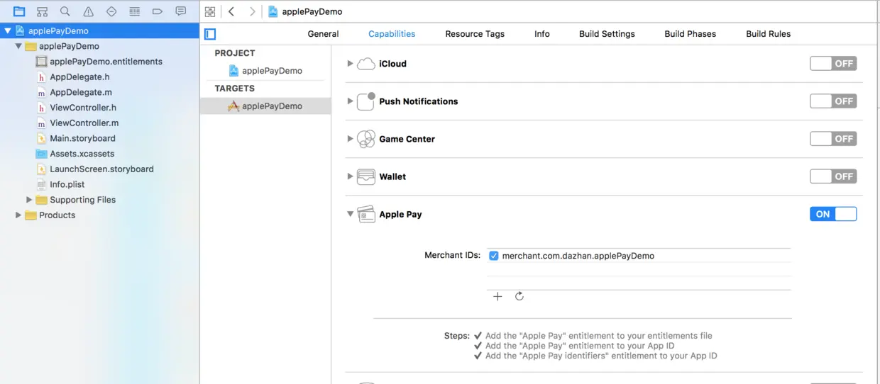 我们在Xcode里面把Apple pay打开 (必须是开发者账号,否则你的里面是没有Apple Pay的)