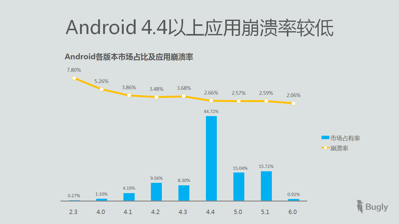 从崩溃数据可以看出,各应用对于主流版本 4.4、5.0、5.1 适配程度较高