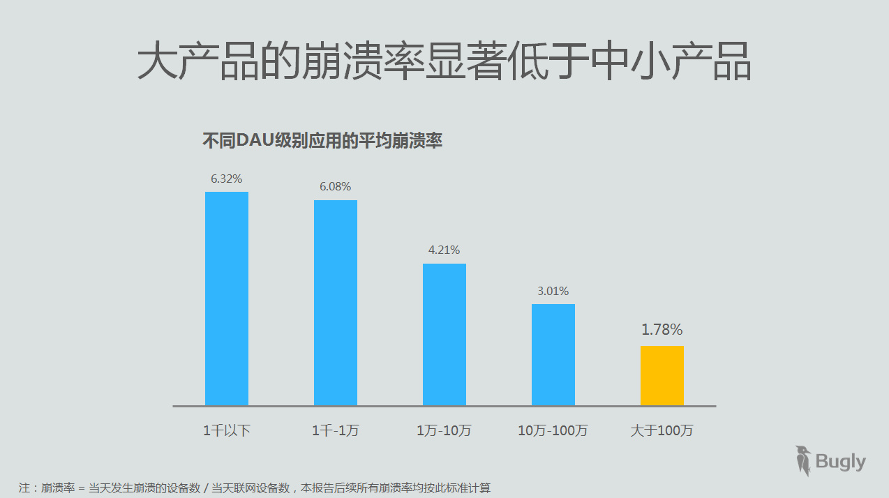 DAU 达到 10万 甚至 100万 级别的产品,崩溃率基本在 3% 以下。而 DAU 低于 1万 的产品,平均崩溃率在 6% 左右。可见巨头们在解决应用崩溃方面还是下了不少功夫的。