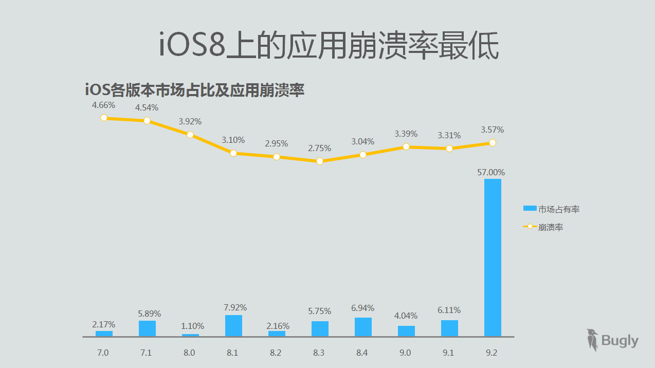 截止到 2016年2月份,9.2 的市场占有率最高,超过了 55%。但 iOS 7 和 iOS 8 仍然占据一定的市场比例;各系统版本的崩溃率从高到低整体上是 iOS 7 > iOS 9 > iOS 8,在应用开发适配系统版本时,iOS 8 系列版本仍是当前适配最好的,但随着 iOS 9 的继续普及,情况将得到改变。