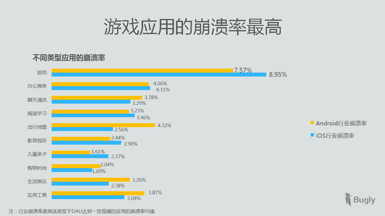 在 iOS 和 Android 这两大平台上,游戏的崩溃率都远高于应用类型。另外崩溃率具有一定程度的行业特性,同行业不同平台(指 Android 和 iOS )应用间的崩溃率差别不大。