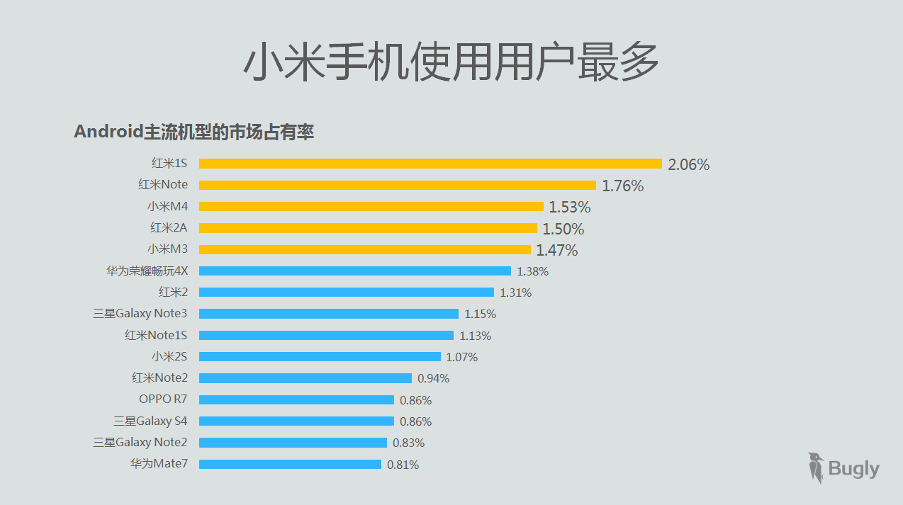 在市场占有率最高的 Top15 Android 机型中,小米手机占据了九席,这是目前存量市场的数据