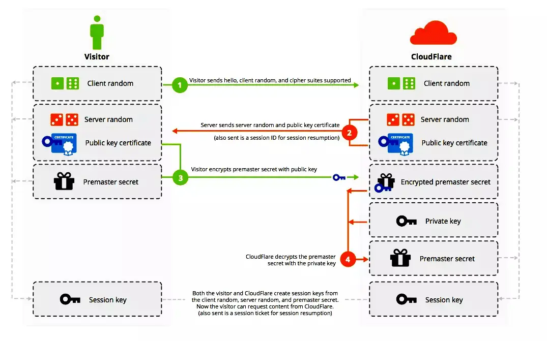 最常见的密钥交换方式是 RSA,下面这张图清晰的描述了这个过程:
