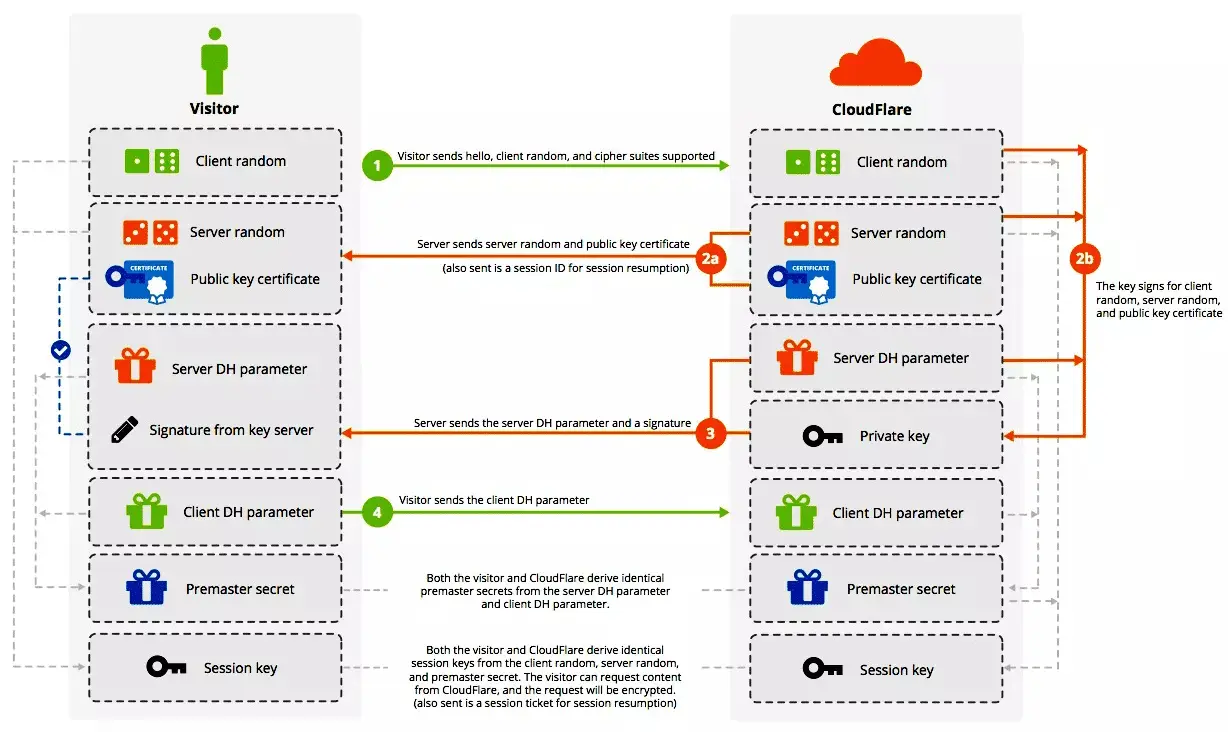实际上,目前大部分 HTTPS 流量用的都是 ECDHE 密钥交换。ECDHE 是使用椭圆曲线(ECC)的 DH(Diffie-Hellman)算法。下图是 DH 密钥交换过程:
