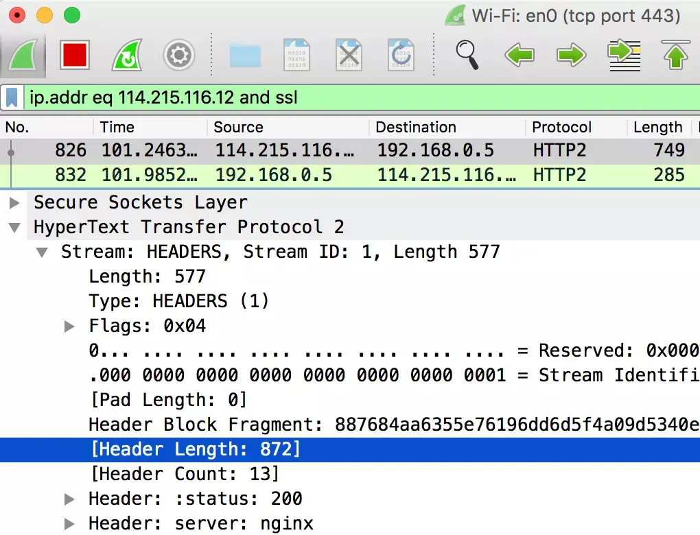 HTTP/2 中只能使用 TLSv1.2+,还禁用了几百种 CipherSuite(详见:TLS 1.2 Cipher Suite Black List)。实际上,HTTP/2 允许使用的 CipherSuite 必须采用具有前向安全性的密钥交换算法,不允许使用 RSA 密钥交换。这也是为什么 RSA Private Key 无法解密 HTTP/2 加密流量。