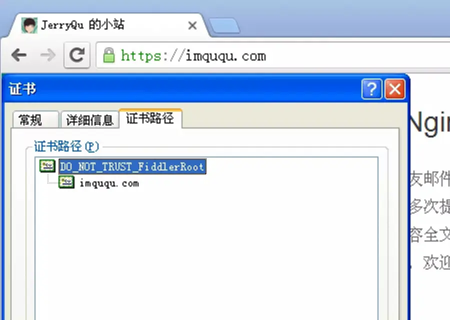 对于 Fiddler 这一类调试工具来说,能够解密 HTTPS 流量的关键在于他们会往系统受信任的根证书列表导入自己的证书,这样他们的自签证书就能被浏览器信任。进入 Fiddler 设置中的「HTTPS」Tab,勾选相关功能后,就可以顺利解密和修改 HTTPS 流量。这时在浏览器中可以看到这样的证书链: