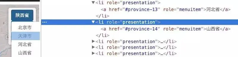 最初的时候要用Event的形式来实现,但是发现这样似乎会让其紧耦合。就改用了监听Hash Change的形式来实现,在总的地图上每一个省都有一个对应的ID,这个ID会对应相应的省的数据。如下图所示: