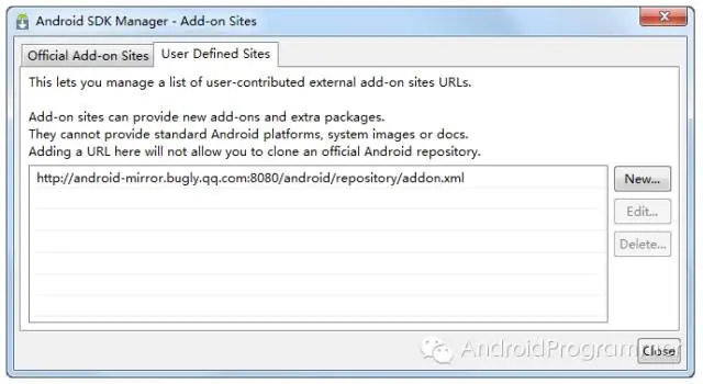 点击 "User Defined Sites",新建,添加http://android-mirror.bugly.qq.com:8080/android/repository/addon.xml