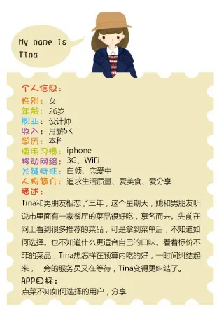 用户Tina:性别、年龄、职业、收入、学历、使用习惯、使用网络、关键特征、目标以及故事描述,这些作为人物角色模型的故事板信息内容。