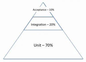 那么我们给这个东西做单元测试的时候,不是测这一整个login流程。这种整个流程的测试:给两个输入框设置正确的用户名和密码,点击login button, 最后页面得到更新。叫做集成测试,而不是单元测试。当然,集成测试也是有他的必要性的,然而这不是我们每个程序员应该花多少精力所在的地方。在这方面,有一个理论叫做Test Pyramid,如下图所示: