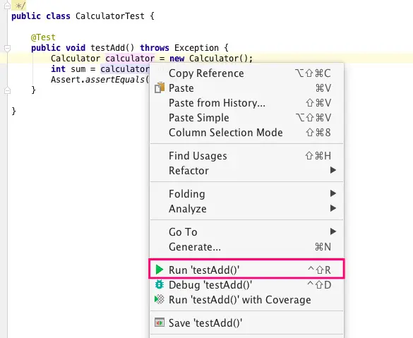打开CalculatorTest,用鼠标右键点击testAdd()方法,选择Run testAdd(), 如下图所示: