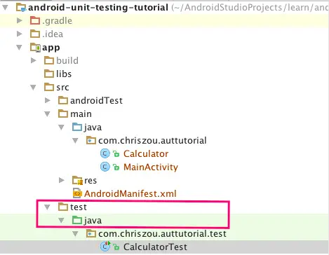 我们知道,在一个android gradle project中,源代码默认是放在src/main/java下面的。而对应的单元测试代码则是放在src/test/java下面的,如下图所示: