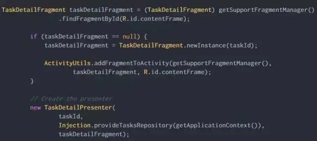 我们可以从上面看到整个创建过程,而且要注意的是创建后的fragment实例作为presenter的构造函数参数被传入,这样就可以在presenter中调用view中的方法了。