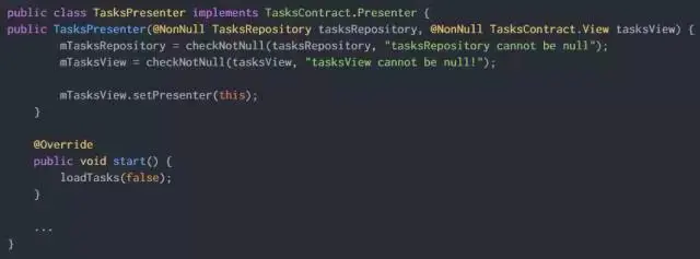 presenter构造函数中调用了view得setPresenter方法将自身实例传入,start方法中处理了数据加载与展示。如果需要界面做对应的变化,直接调用view层的方法即可,这样view层与presenter层就能够很好的被划分。