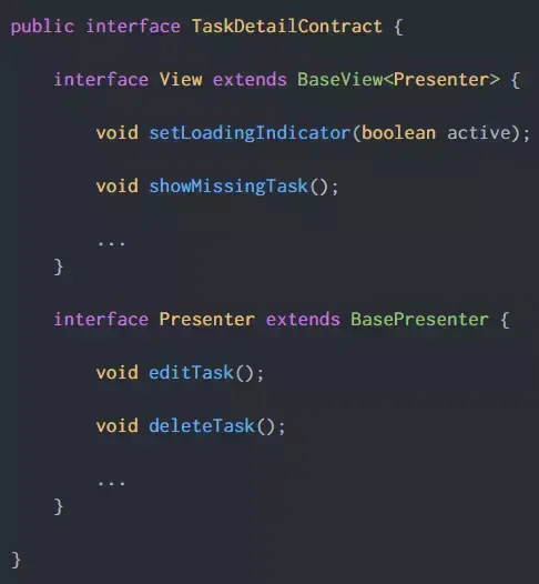与笔者之前见到的所有mvp实现都不同,官方的实现中加入了契约类来统一管理view与presenter的所有的接口,这种方式使得view与presenter中有哪些功能,一目了然,维护起来也方便,实例如下