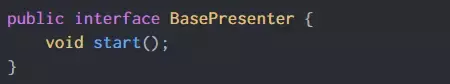 上面可以看到setPresenter方法,该方法继承于父类,通过该方法,view获得了presenter得实例,从而可以调用presenter代码来处理业务逻辑。我们看到在onResume中还调用了presenter得start方法,下面我们再看presenter的实现
