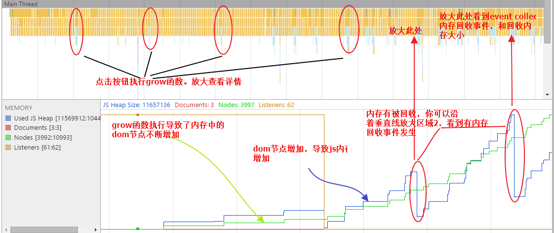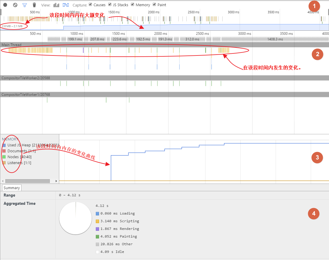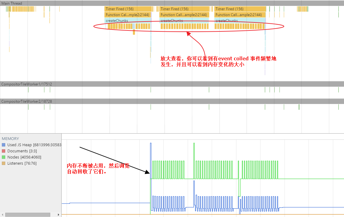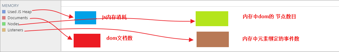 随着在事件发生的,除了dom的渲染和绘制等事件的发生之外,相应地内存也会发生变化,而这种变化我们可以从区域3种看到: