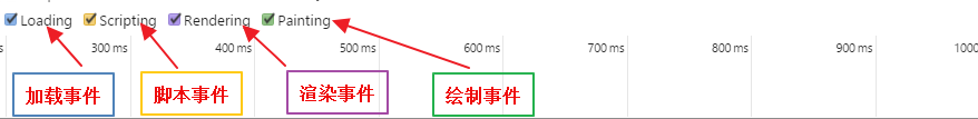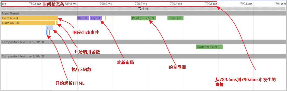 在操作界面时,我们点击了一次button,它耗费了大约1ms的时间完成了从响应事件到重绘节目的一些列动作,上图就是在789.6ms-790.6ms中完成的这次click事件所发生的浏览器行为,其他的事件行为你同样可以通过滑动滑轮缩小区域来观察他们的情况。在区域2种,每一种颜色的横条其实都代表了它自己的独特的意义: