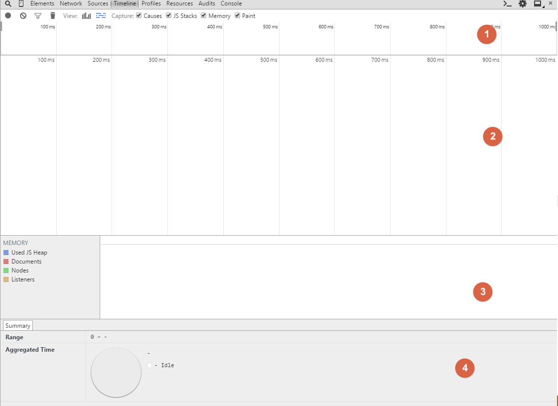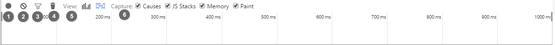 新建一个html项目,然后再Chrome中打开它,接着按F12切换到开发者模式,选择Timeline面板,点亮区域1左上角的那个小圆圈,你可以看到它变成了红色,然后开始操作界面。连续按下button执行我们的js程序,等待所有div的内容都变成hello world的时候再次点击小圆圈,熄灭它,这时候你就可以看到Timeline中的图表信息了,如下图所示: