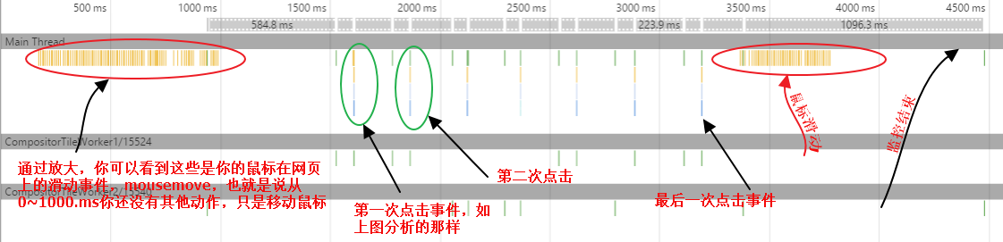 在区域1中,左下角有一组数字2.0MB-2.1MB,它的意思是在你刚刚操作界面这段时间内,内存增长了0.1MB。底部那块浅蓝色的区域是内存变化的示意图。从左到右,我们可以看到刚刚浏览器监听了4000ms左右的行为动作,从0~4000ms内区域1中列出了所有的状态。接下来我们来仔细分析一下这些状态的具体信息。在区域2种,滚动鼠标的滚轮,你会看到时间轴会放大缩小,现在我们随着滚轮不断缩小时间轴的范围,我们可以看到一些各个颜色的横条: