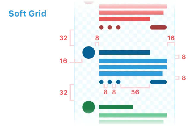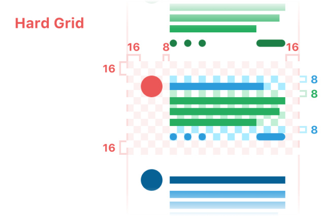 这个系统目前主要有两个版本。其中一个版本是将元素逐一放置在一个以 8pt 为单位的系统显示网格上,我们称之为硬性网格。另一个版本则仅仅是用 8pt 的倍数去度量元素间距,我们称之为软性网格。