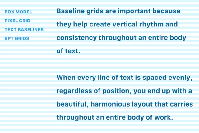 文本基线的应用会非常有利于为你的设计建立纵向一致性。你可以通过将每一行文字的文本基线都对齐一组均匀间隔线,来达到文本元素和其他元素整体上和谐的纵向节奏。