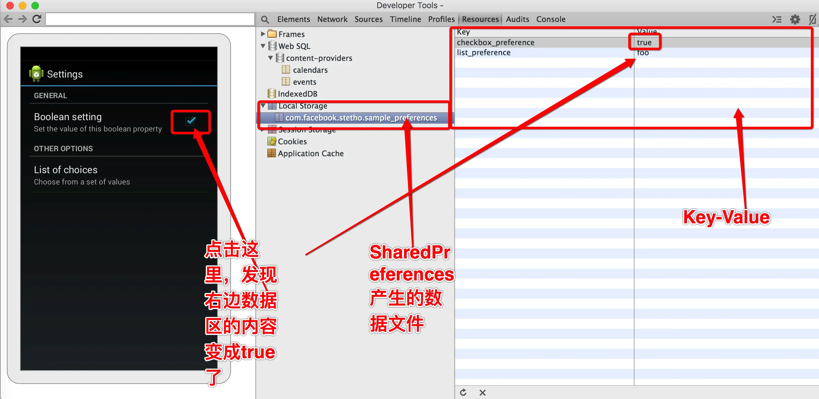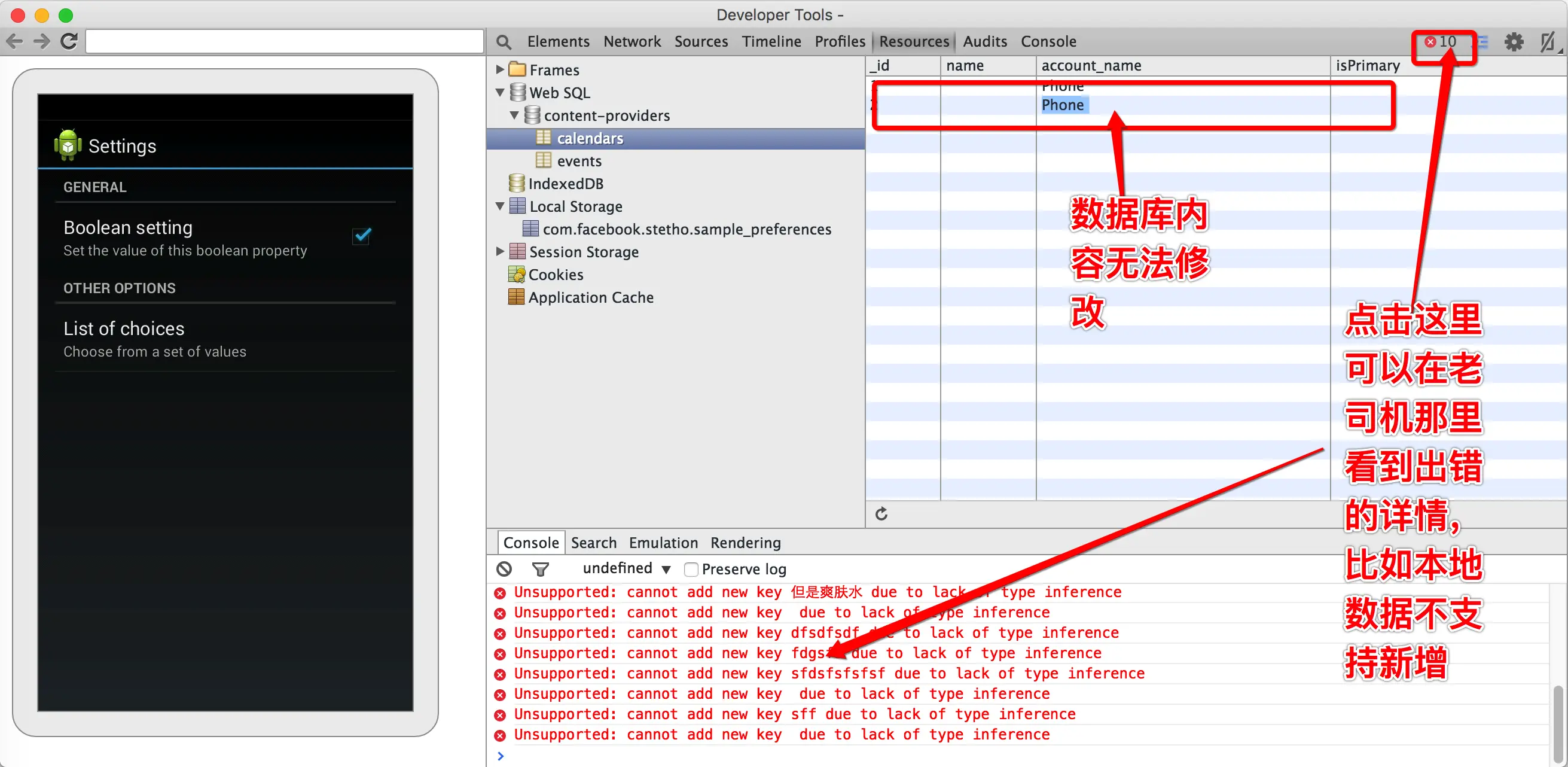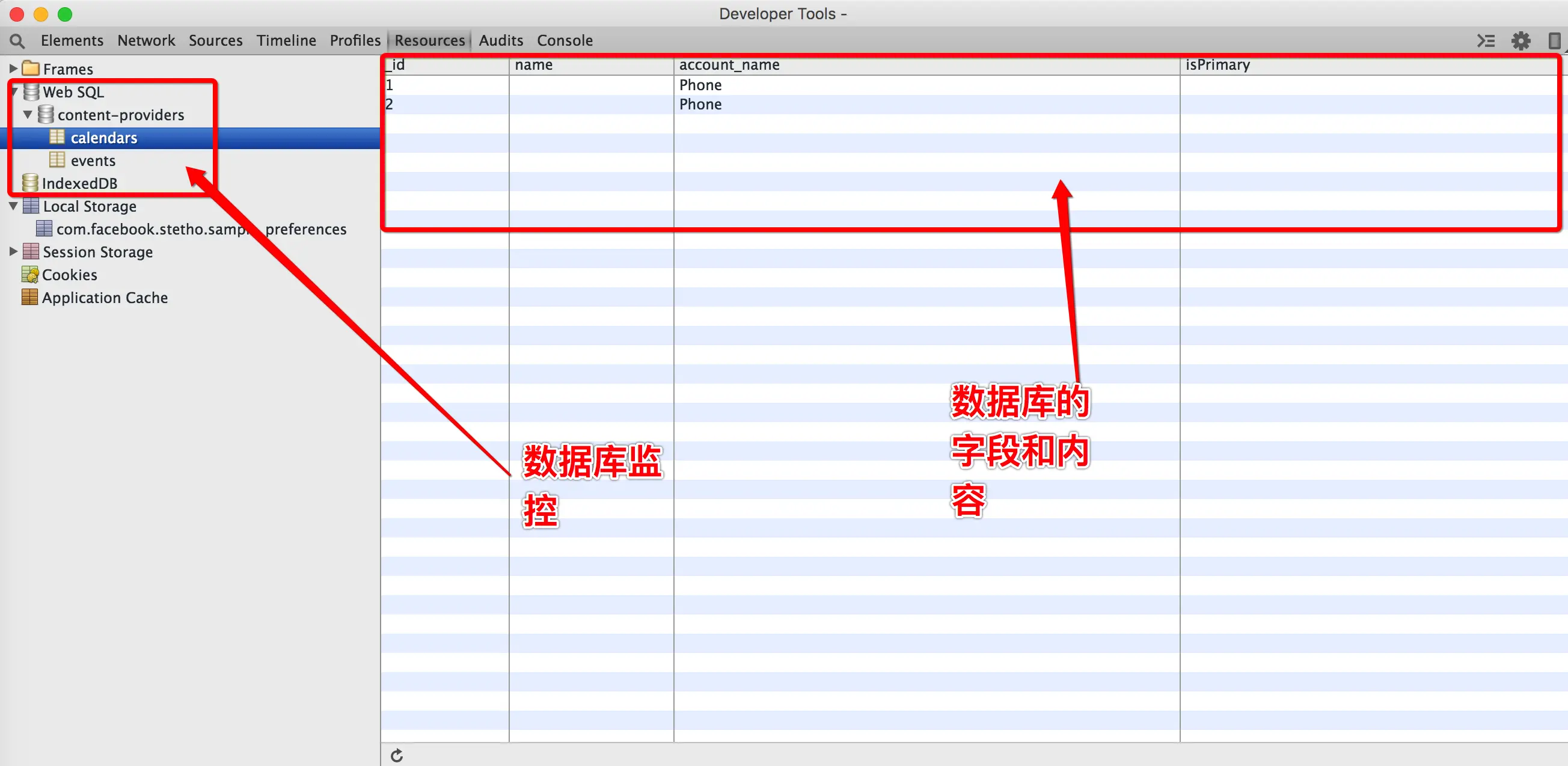 直接跳过”Timeline”, “Profiles”看第六个tab,”Resources”,顾名思义,这里应该就是查看APP内部产生数据的地方啦,目前支持的数据有两种,一种是数据库(ContentProvider和Sql的方式)的数据,另一种是SharedPreferences数据