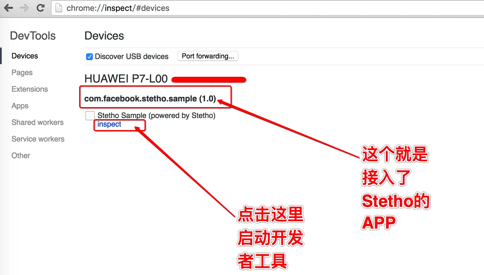 - 在Chrome浏览器地址栏中输入chrome://inspect,会看到如下这张图,如果图里面没有你的APP,请返回到上面检查代码接入是否正确